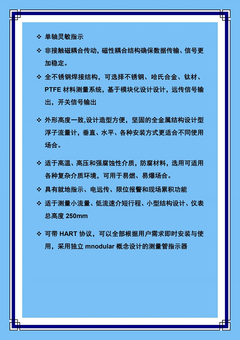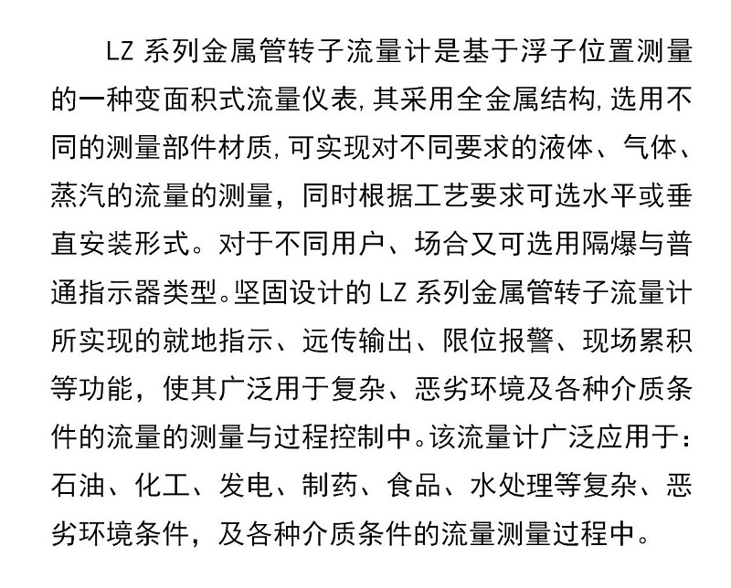 LZ系列金屬管轉(zhuǎn)子流量計是基于浮子位置測量的一種變面積式流量儀表,其采用全金屬結(jié)構,選用不同的測量部件材質(zhì),可實現(xiàn)對不同要求的液體、氣體、蒸汽的流量的測量,同時根據(jù)工藝要求可選水平或垂直安裝形式。