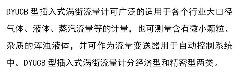 DYUCB型插入式渦街流量計(jì)可廣泛的適用于各個(gè)行業(yè)大口徑氣體、液體、蒸汽流量等的計(jì)量,也可測(cè)量含有微小顆粒、雜質(zhì)的渾濁液體,分經(jīng)濟(jì)型和精密型兩類(lèi)。